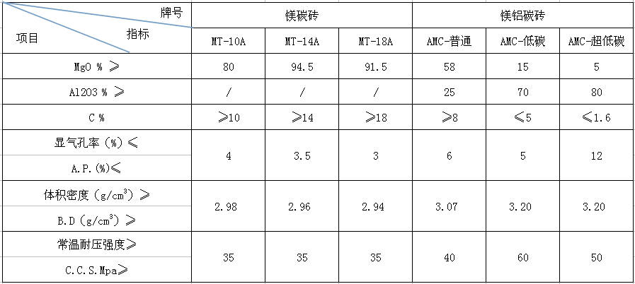 我公司生产的镁碳砖、镁铝碳砖以电熔镁砂、高品质刚玉和优质石墨为主要原料并添加抗氧化成分以树脂作结合剂配置机压成型。产品热震性能好,抗侵蚀,抗剥落广泛用于炼钢转炉,电弧炉,盛钢桶,精炼炉等热工设备的关键部位。